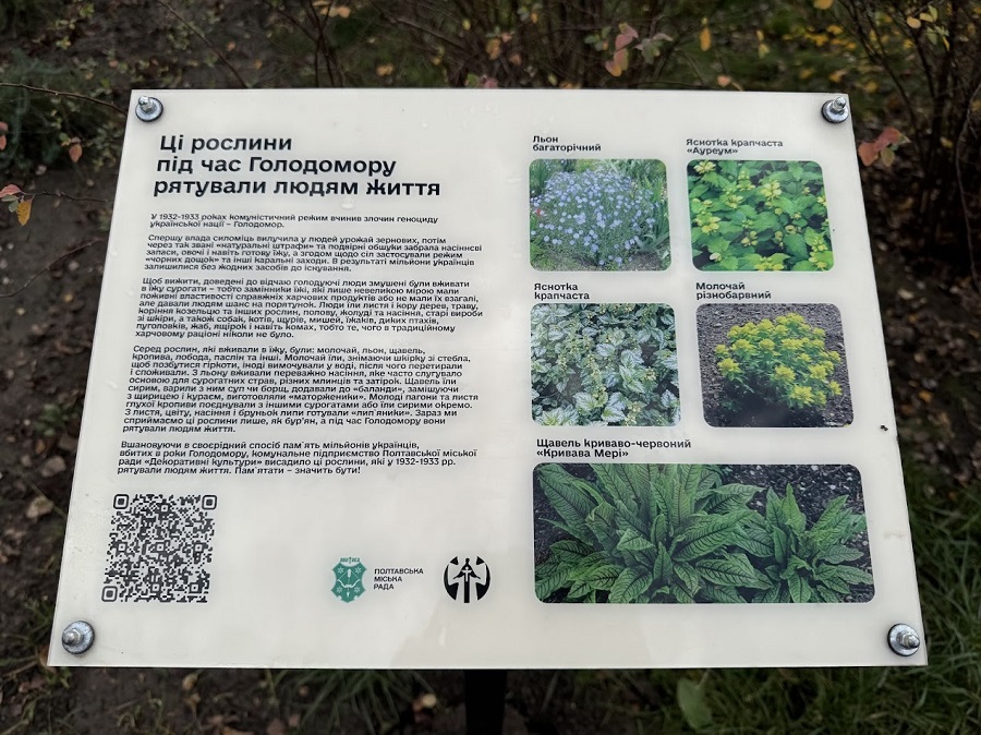 An information plaque was installed next to the plants explaining how they were used during the famine. It also features a QR code that links to the website of the National Museum of the Holodomor Genocide. The link contains a 23-minute account by a witness to the Holodomor from the village of Opishne in the Poltava region, which reveals the personal dimension of the tragedy and preserves a living memory of what was experienced.
